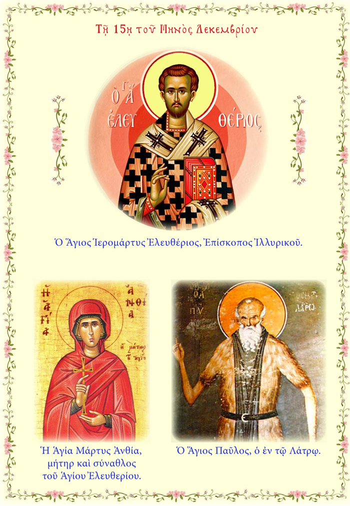 Adorned with the robe of priest / stained with the streams of your blood, / O wise and blessed Eleutherius, over-thrower of Satan / you hastened to Christ your Master. / Pray unceasingly for those who faithfully honor your contest!